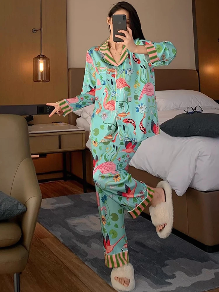 Pajamas for Women in Spring and Summer Long Sleeved Flower and Bird Patterns Hig